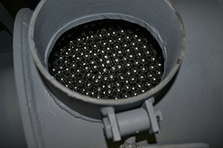 Под воздействием непрерывно соударяющихся и трущихся друг о друга шариков твердые частицы обрабатываемого продукта раздавливаются и истираются. Проходя через решетку, расположенную на выходе, тонкоизмельченная масса продукта отделяется от шариков и подается на дальнейшую обработку. Также освоена модель с движением измельчаемого материала сверху вниз.