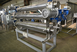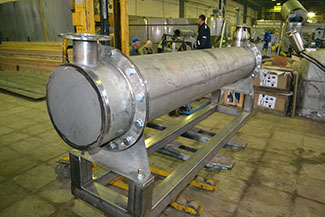 Цилиндр охладителя/пастеризатора расположен на опорах. Трубчатый теплообменник (охладитель) представляет собой одноходовой трубчатый теплообменник. Внутри цилиндрарасположены теплообменные трубки, концы которых герметично развальцованы втрубных решетках. Производительность может меняться в зависимости отначальной и конечной температуры продукта.