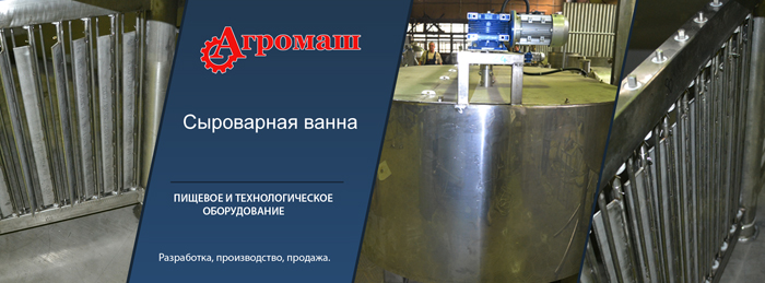 Устройство сыродельной ванны. Состоит из трехстенной емкости, запорного клапана для спуска зерна с сывороткой, колонн и , мостовой конструкции , режуще-вымешиващего инструмента и его привода Сыродельная ванна имеет домкрат для наклона ванны и сито для отбора сыворотки, а также мерную линейку .